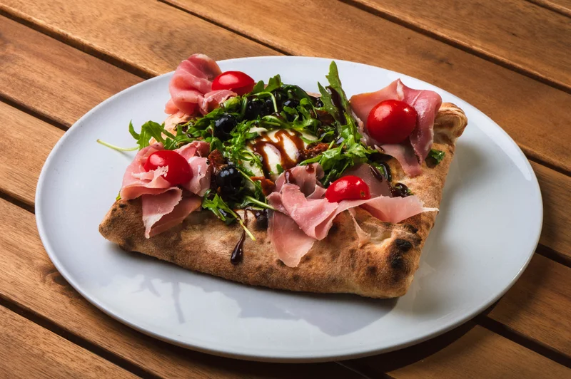 San Marzano (D.O.P.) paradicsomszósz, fiordilatte, bivaly mozzarella (D.O.P), rucola, szárított paradicsom, fekete olívabogyó, citrom, pármai sonka, balzsamecetkrém
