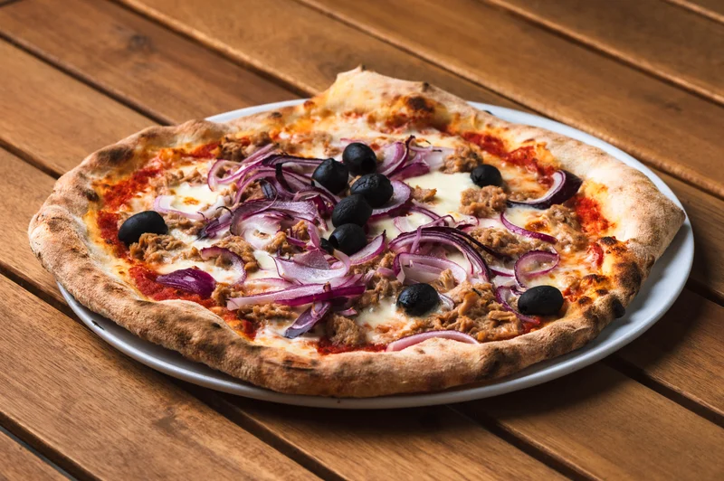 paradicsomszósz, fiordilatte, tonhal, hagyma, fekete olívabogyó